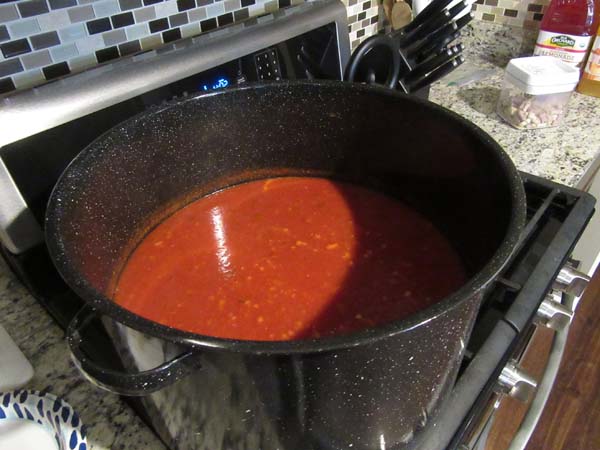I clean my jars and lids in the dishwasher. If you are pressure canning, there is no need to boil the lids. Then put a Tbsp of Lemon Juice in each jar, (2 Tbsp for quarts) and ladle the sauce in each jar using a canning funnel until it is filled to 1/2 inch headspace at the top. I use a bamboo skewer to run around the inside of the jar to bring any air bubbles to the top. Then wipe the rim of each jar and put the lid on and gently screw on the cap. I have learned that if you press down with one finger on the top of the lid while you are tightening, tighten until the jar starts to rotate. If they are tightened too much, the jars can break while processing.